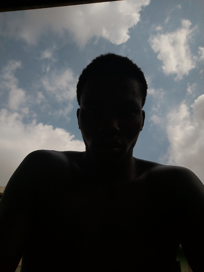 The image captures a severely backlit portrait of an individual, likely male, positioned centrally and looking directly towards the camera. The subject's head, shoulders, and upper chest are rendered in deep silhouette against a bright sky, making distinct facial features largely obscured, though the general outlines of the nose and mouth are faintly visible from close inspection. The individual has short, dark, tightly curled hair and appears bare-chested. The background consists of a blue sky with scattered white cumulus clouds. A narrow, dark, horizontal architectural beam or structure is present along the top edge of the frame. The scene is situated in Keffi, Nigeria.