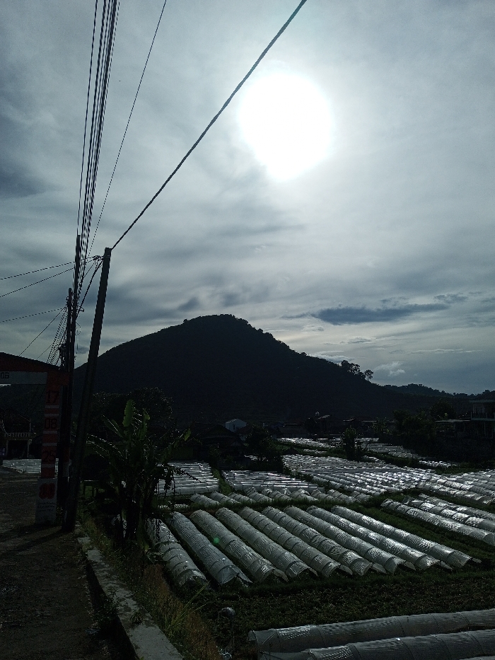 The image displays an agricultural landscape in Salai Har Htan, Myanmar, under an overcast sky with a prominent, bright sun centered in the upper left quadrant. The scene is dominated by a large, dark, heavily forested mountain or hill in the background, appearing in silhouette. In the midground, a field stretches across the frame, covered extensively with numerous parallel rows of low-lying, elongated structures made of translucent or white plastic sheeting, consistent with agricultural polytunnels or greenhouses. In the foreground on the left, a dark utility pole supports multiple overhead electrical or communication wires that traverse diagonally across the upper portion of the frame. Attached to the pole is a vertical sign with red and white markings, partially obscured. Directly below the wires and to the right of the pole, green foliage, possibly banana plants, is visible. A dirt path or road runs along the bottom left edge, bordered by a concrete curb. No individuals are present in the frame. The overall lighting suggests daylight with diffuse ambient light, though the direct sun creates a bright spot in the sky.