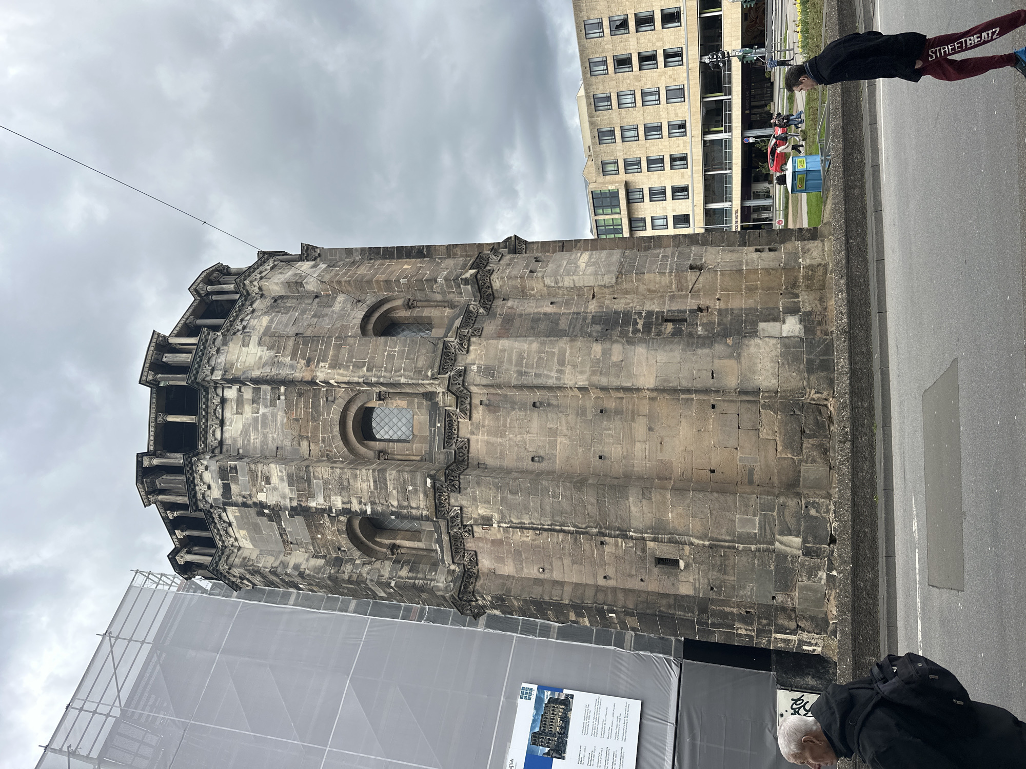 The image captures the Porta Nigra, an ancient Roman city gate in Trier, Germany. The Porta Nigra is a large, dark sandstone structure with multiple levels and arched windows. It is partially covered by scaffolding and a protective mesh. The sky is overcast with gray clouds. In the foreground, a street runs alongside the structure, with a person wearing a black jacket and a backpack walking. Another person wearing red pants with the word "STREETBEATZ" printed on them is walking in the background. Across the street, modern buildings are visible, along with some pedestrian traffic and a few cars.