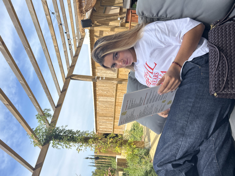 - "An adult female is seated on a grey outdoor cushion, holding a white menu featuring a green leaf logo" by FM-Iwwj43, licensed under CC BY 4.0