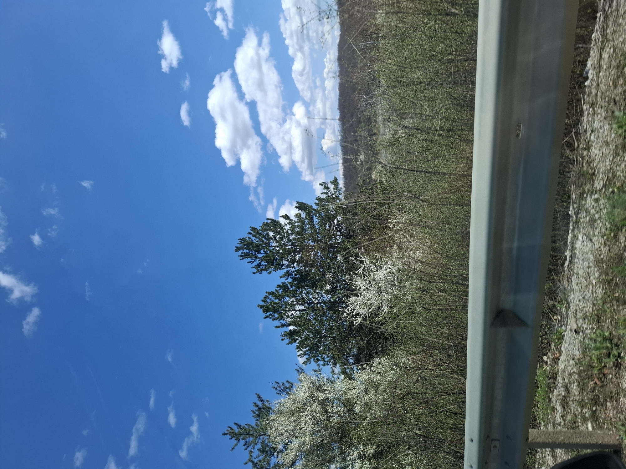 view from a vehicle. A guardrail is prominently featured on the right side of the image. Beyond the guardrail is vegetation, including trees and bushes, some of which are in bloom with white flowers. In the background, there's a hazy view of more distant trees. The sky is blue with scattered white clouds. The location in Blagovo, Bulgaria cannot be confirmed with the provided image.