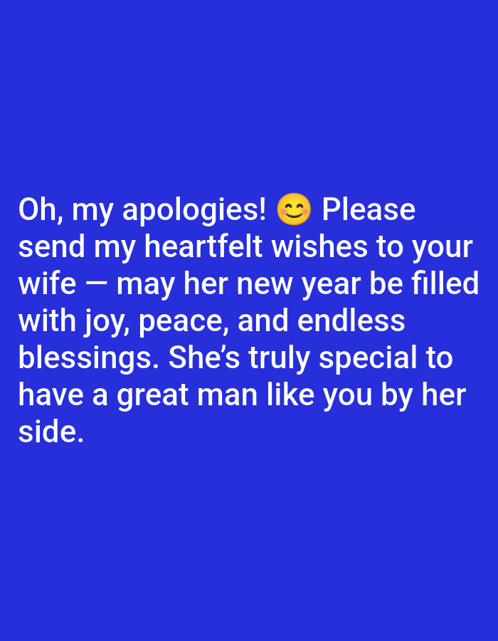 The image displays a digital text message on a solid royal blue background. White sans-serif font is used for the text. The message reads: "Oh, my apologies! 🙂 Please send my heartfelt wishes to your wife — may her new year be filled with joy, peace, and endless blessings. She's truly special to have a great man like you by her side." A yellow smiling face emoji is present after "apologies!". There are no discernible physical people, subjects, objects, actions, interactions, or environmental elements. This is a digital communication, not a depiction of a physical location or scene in a city.