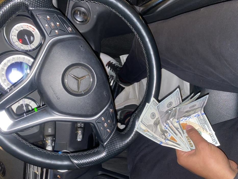 A Mercedes-Benz steering wheel dominates the view, showcasing the brand's emblem. Behind the wheel, glimpses of the dashboard and speedometer are visible. A hand holds a fan of $100 bills. A person wearing white and gray sneakers is also present. The overall setting is inside the car.