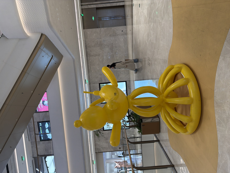 The scene depicts the interior of a modern shopping mall located in Qinhuai District, China. A large, bright yellow sculpture, designed in the style of an inflated balloon animal, balances on its back with limbs extending upwards and outwards. Its segmented base, resembling multiple tubular extensions, rests on an irregular light brown platform on the polished light marble floor. A single adult individual is observed walking from left to right in the midground, behind the sculpture, wearing a light-colored long coat, dark trousers, and light shoes. The environment features high ceilings with recessed strip lighting, light grey marble-clad walls, and a large diagonal architectural element, likely an escalator support structure, in the upper frame. Upper levels are visible with glass railings, multiple digital display screens (one indicating "J.L.G FLOOR P.L4" and another displaying an advertisement with a person), and glimpses of retail spaces, including a light pink fox-shaped display. A small potted plant with green foliage is situated behind the yellow sculpture. On the right, two sets of double doors with green exit signs are visible against the marble wall. The area is brightly illuminated by artificial light, reflecting on the polished floor.