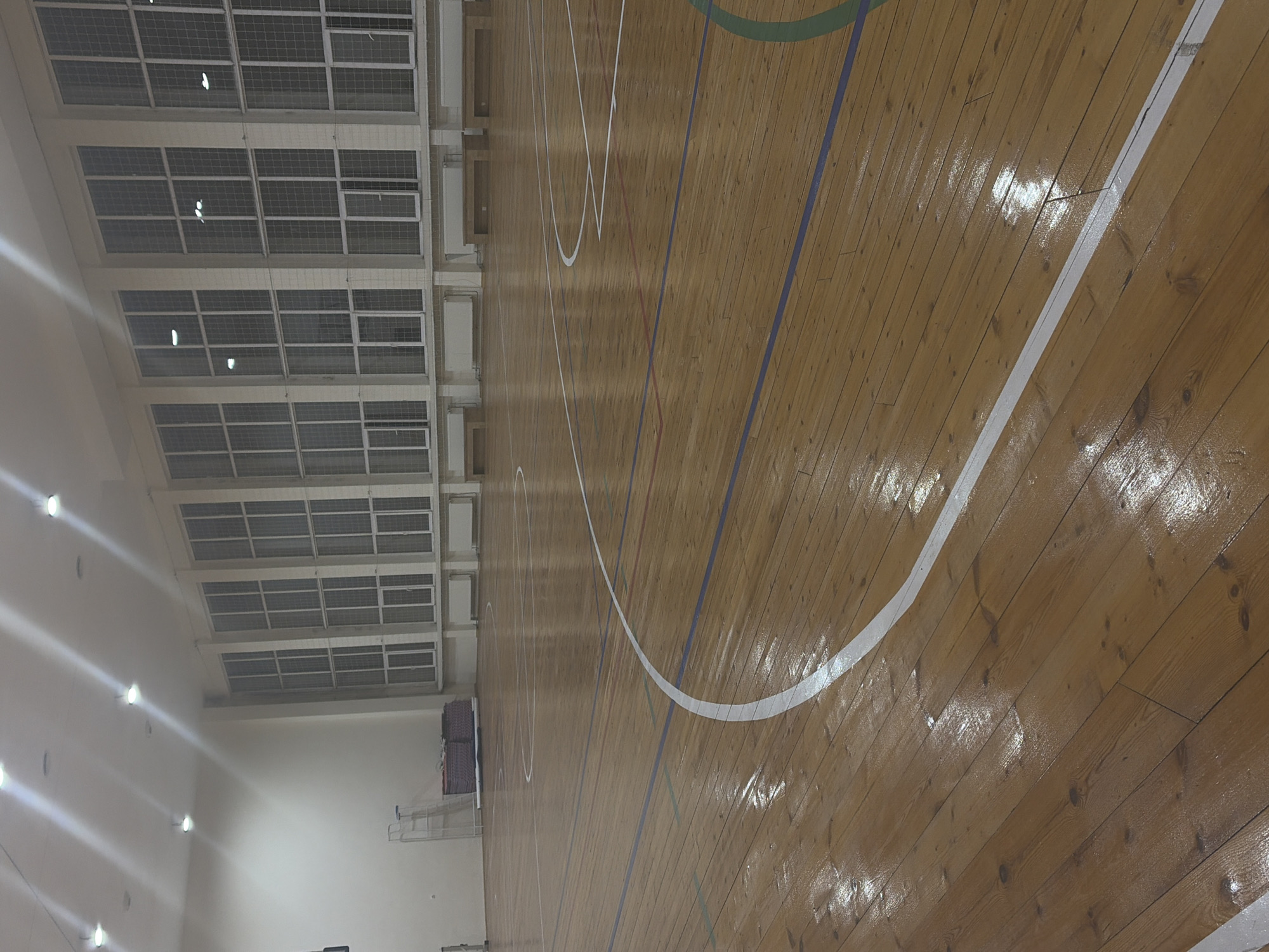 This image presents the interior of a brightly lit gymnasium located in Varna, Bulgaria. The foreground and midground are dominated by a polished, light-brown wooden floor, consisting of individual planks, marked with distinct white, blue, and green lines delineating various sports courts. The floor's varnished surface reflects the overhead lighting. The ceiling is white and features multiple circular, recessed light fixtures emitting strong, artificial illumination. The right wall of the gymnasium is characterized by a series of at least five very tall, multi-paned windows, each composed of numerous smaller rectangular glass sections divided by white frames. Below these windows, white radiators are mounted along the wall, interspersed with light-colored wooden benches. On the far left side of the room, against a plain, light-colored wall, a tall, white metal equipment stand is visible, behind which a stack of purple or reddish-brown mats or padding is stored. The gymnasium appears empty, with no individuals or active events taking place.