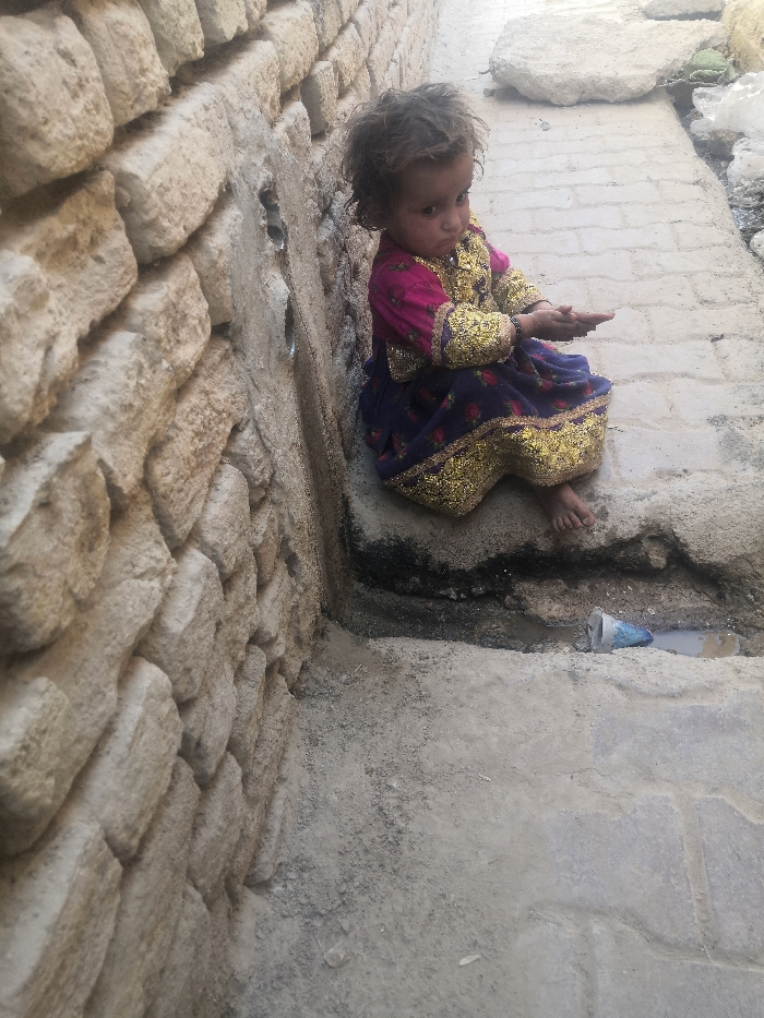 - "A young, barefoot child is seated on a concrete ledge in a confined outdoor area, consistent with an alleyway, in Quetta, Pakistan" by FM-25YsE2, licensed under CC BY 4.0