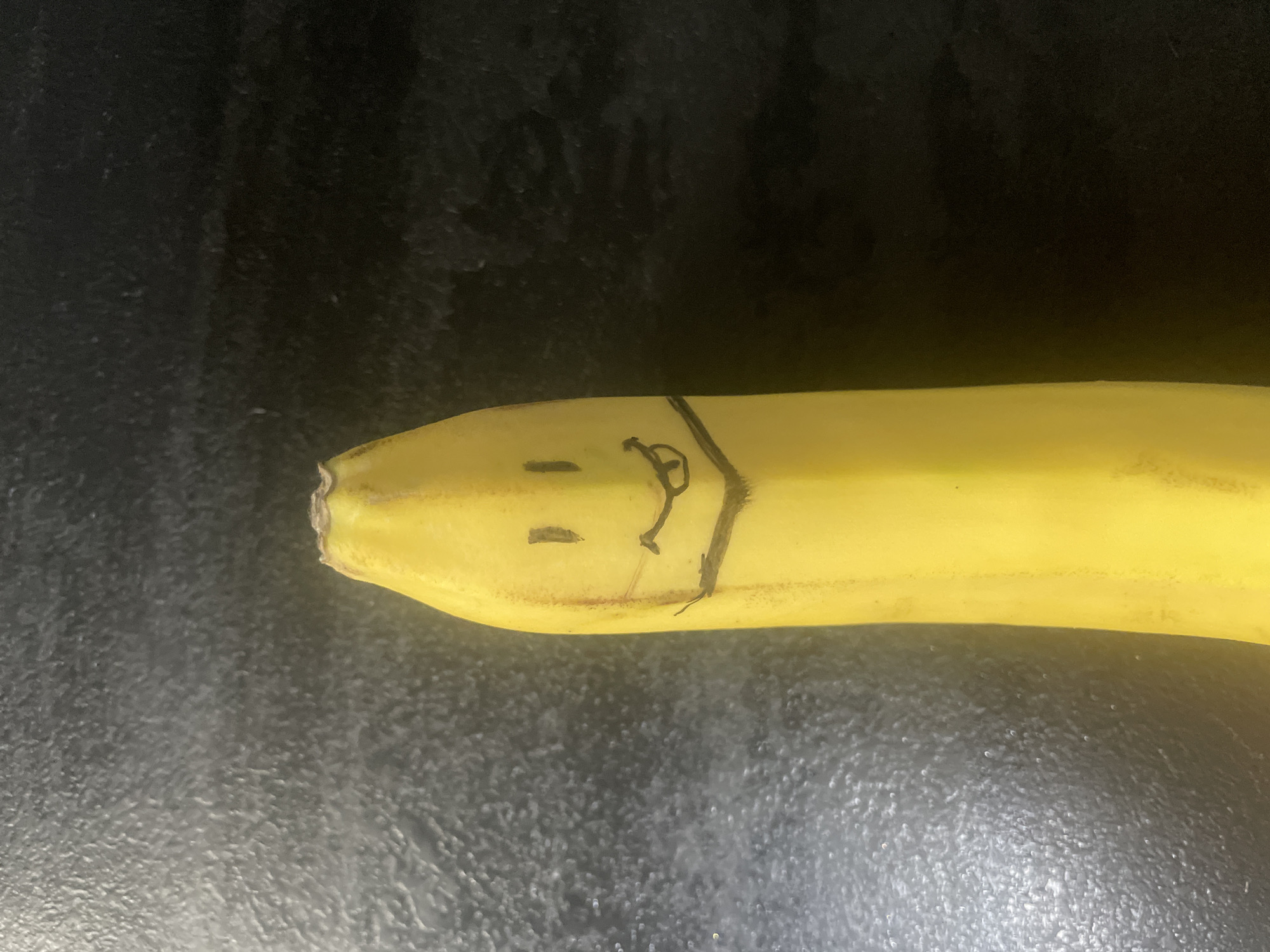 The scene is an indoor setting, located in Novi Sad, Serbia. A single, intact, yellow banana is positioned vertically slightly right of center in the frame, with its stem-end oriented towards the top. The banana's skin displays characteristic ripening coloration and minor surface imperfections. A facial depiction has been rendered on its surface using black ink. This depiction comprises two short, vertical lines for eyes, a broad upward curve for a mouth, within which a downward-curved line indicates a tongue, and a horizontal line positioned below the mouth, flanked by two short, downward-angled lines. The background consists of a dark, textured, semi-reflective surface, consistent with a countertop, exhibiting variable surface sheen and subtle relief. Ambient lighting illuminates the scene from the upper left, casting a slight shadow to the right of the banana. No human subjects or active interactions are present within the frame.