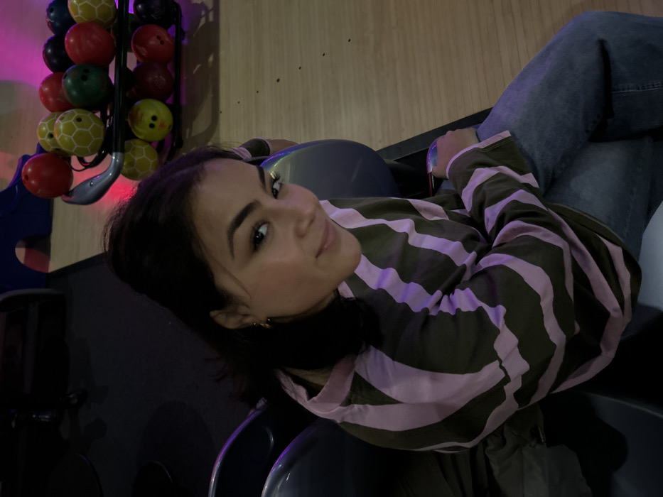 A young woman with dark hair and fair skin smiles at the camera. She is wearing a striped long-sleeved shirt in shades of green and pink, paired with blue jeans. She is positioned in what appears to be a bowling alley, with bowling balls visible in the background. The image is slightly rotated, with the woman's face being the focal point. The lighting seems to be a mix of natural and artificial, creating a casual, relaxed atmosphere.