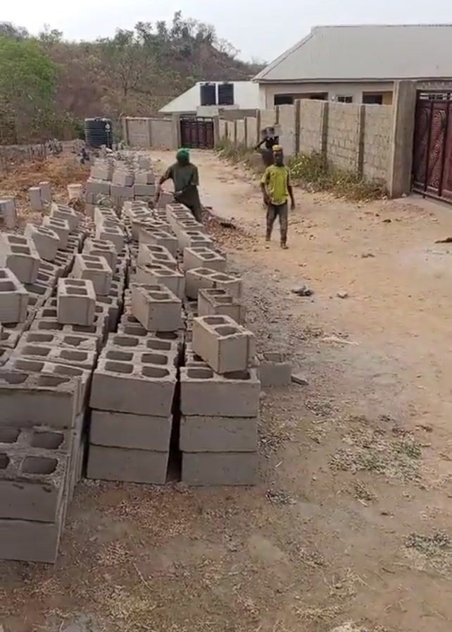 The scene depicts an outdoor construction site. Stacks of gray concrete blocks are prominently featured in the foreground, arranged in neat rows. Three men are visible further in the background. One of the men, wearing a green shirt and a green cap, stands near the blocks and appears to be inspecting them. Another man, wearing a yellow shirt, is walking in the direction of the blocks. The third man, whose attire is obscured, trails behind. A partially constructed building is seen in the background, with a gray roof and tan-colored walls. A low wall runs along the property line, and a dark, ornamental gate is located on the right side of the frame. The ground is mostly dirt and sparse vegetation. The weather appears overcast.
