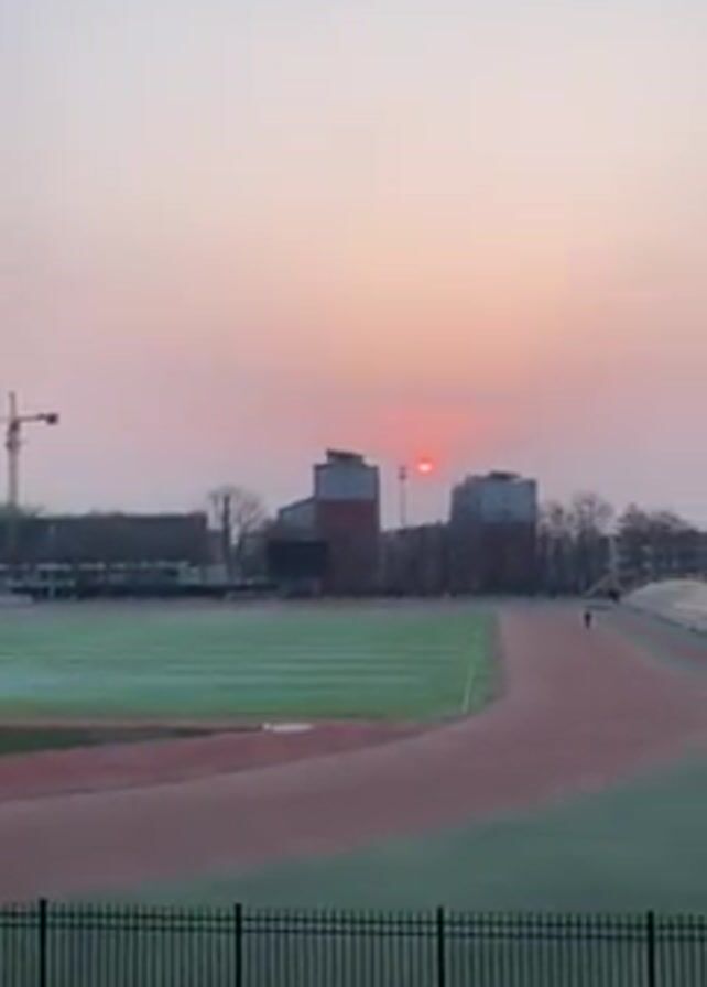 The camera, from behind a dark metal fence, surveys a sports field with a track and a green artificial turf playing field marked with white lines. Two figures are visible, one walking along the track and the other on the field closer to the fence. Behind the field, two buildings with flat roofs are silhouetted against the rising sun, which is a bright red orb in the hazy sky. To the left, a construction crane is visible, and the sky transitions from a pale yellow near the horizon to a light pink above.