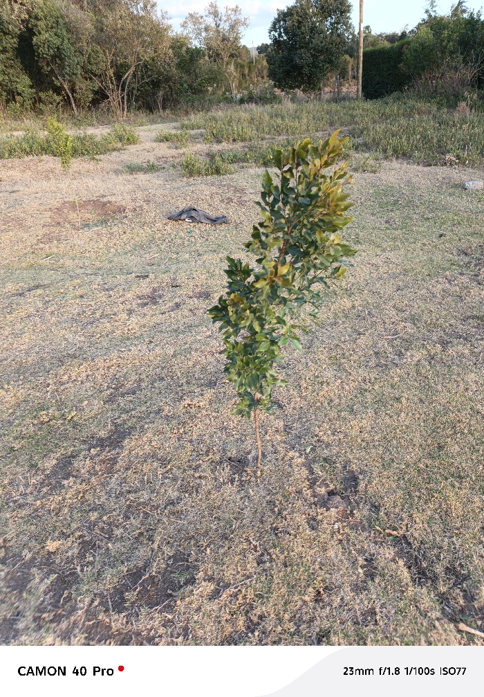 The image depicts an outdoor, open area in Malewa West ward, Kenya, characterized by sparse, dry, light brown and green vegetation interspersed with patches of exposed soil. A young tree sapling with a thin brown trunk and green foliage stands prominently in the mid-ground, slightly right of center. Approximately three meters to the left and slightly behind the sapling, a dark-colored, crumpled garment, consistent with a jacket or similar fabric item, lies flat on the ground. The background comprises a dense line of various green trees and bushes, forming a natural boundary. A wooden utility pole is visible extending above the tree line in the upper-right quadrant. The sky, partially visible above the tree line, is light blue. No individuals are present, and no direct activity or interaction is depicted within the scene.