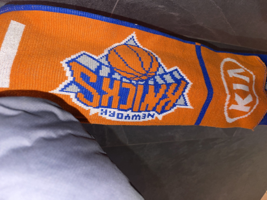 The image displays a close-up, angled view of a knitted sports scarf, predominantly orange and blue, with white and grey details. On the left side, the upper arm of a person, clad in a light grey or light blue long-sleeved garment, is partially visible, indicating the scarf is being held or worn. The scarf features the "NEW YORK KNICKS" logo, consisting of the word "NEW YORK" vertically aligned, "KNICKS" horizontally in blue with grey shading, and a basketball graphic, all within a starburst-like outline. Further down the scarf, the white "KIA" logo is present in an oval shape against the orange background. The background environment is a dark, textured surface, possibly a wall. The image contains no visual information or landmarks that would permit the identification of its location within the city of Khimki, Russia.