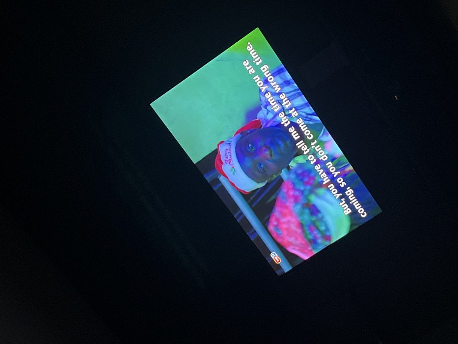 A screen, tilted at an angle on a black background, displays a scene featuring a person wearing a Santa hat and colorful clothing