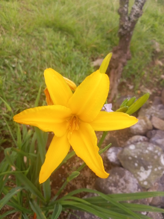 The image, taken in Ciherang, Indonesia, presents a close-up, static view of a single yellow Hemerocallis (daylily) flower. The flower, centrally positioned, is in full bloom, displaying six prominent, bright yellow petals that emanate from a central cluster of yellow stamens and a pistil. Green, strap-like foliage extends from the base of the flower and along the lower portion of the frame. The immediate ground beneath the flower consists of dark brown soil. The background to the upper left and top is dominated by out-of-focus green grass. In the upper right background, a blurred segment of a greyish-brown tree trunk is visible. The lower right background features several grey rocks, some displaying lighter grey or white patches. No individuals or animals are present, and no actions or interactions are occurring. The scene is illuminated by ambient daylight.