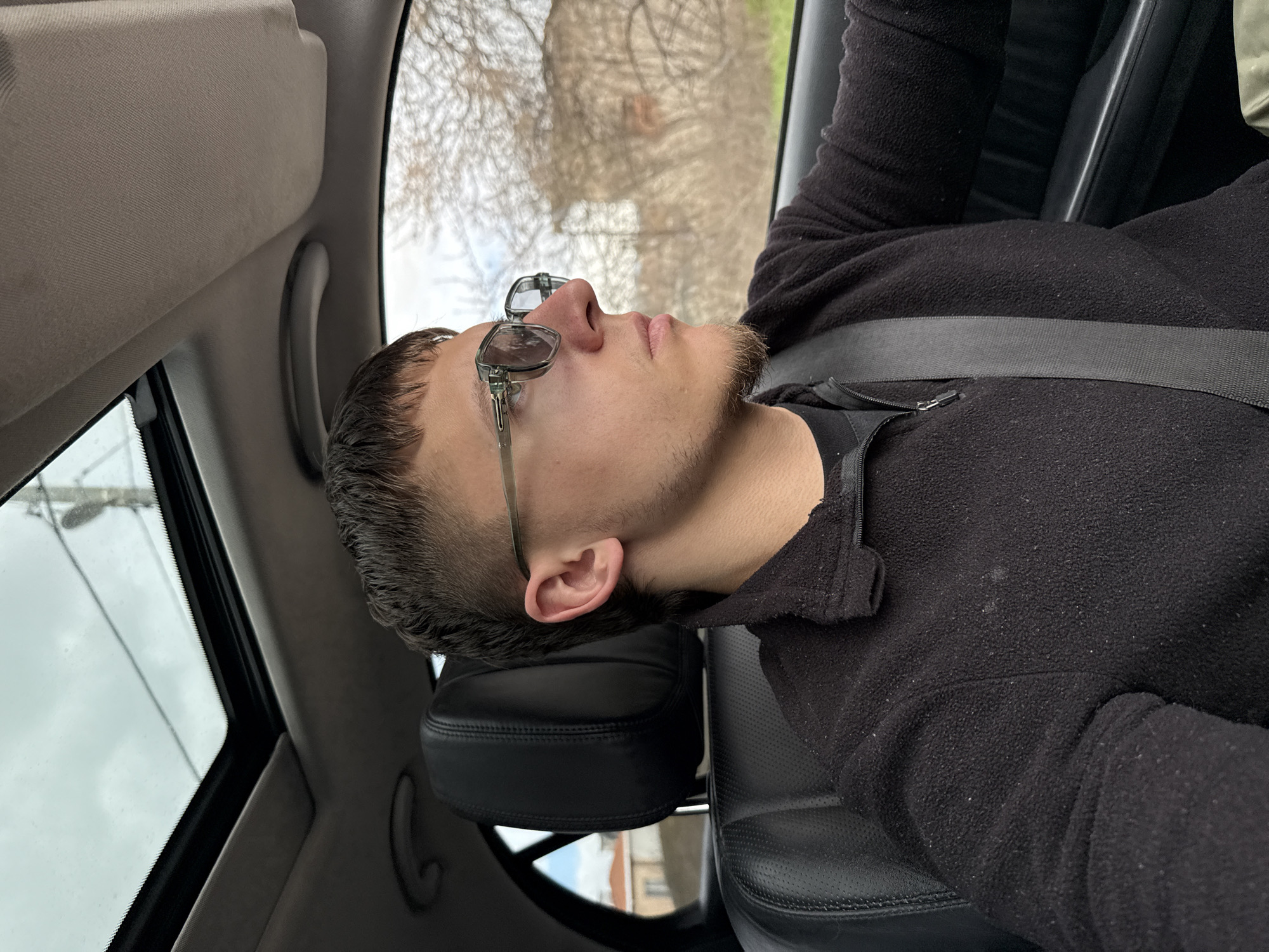 The image depicts a young adult male seated in the driver's seat of a vehicle, looking towards his right. He has short, dark hair with faded sides, a light goatee, and wears rectangular sunglasses with clear frames and dark lenses. He is dressed in a black fleece quarter-zip pullover over a dark undershirt, with a gray shoulder seatbelt secured across his chest and left shoulder. The vehicle's interior features black leather seating with perforated surfaces, a gray headliner, and an open sunroof that reveals an overcast sky and overhead power lines. Through the vehicle's windows, a blurry exterior environment is visible, comprising bare trees and a distant building with an orange-tiled roof, suggesting a residential or rural setting. The location is Yana, Bulgaria.