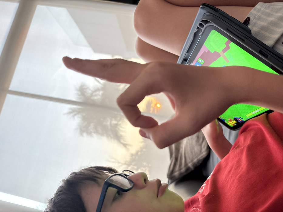 A person wearing glasses and a red shirt is looking upward toward a window. Their hand is raised, forming a circle with their index finger and thumb, framing the sunset visible through the window. The window also shows the silhouette of a palm tree. A phone or tablet in a black case is also visible. The screen of the device displays a game with green and brown graphics. Part of another person's leg is visible in the background.