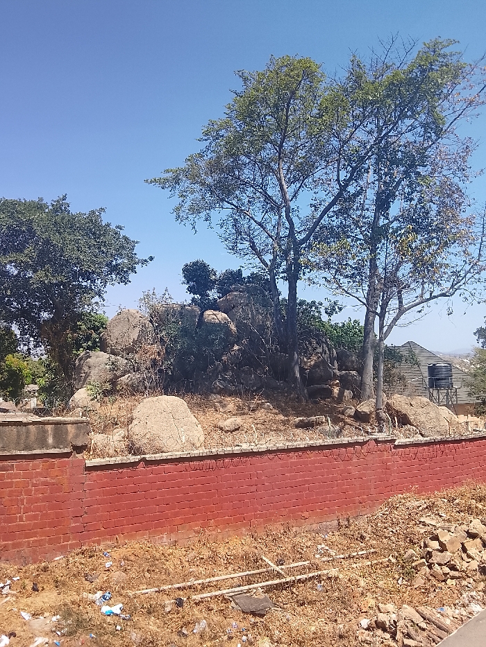 This image captures an outdoor scene in the city of Jos, Nigeria, under a clear, bright blue sky. The foreground features dry, light brown soil extensively littered with scattered refuse, including plastic bags, wrappers, and debris. Above this, a red brick wall extends horizontally across the lower-mid section of the frame, topped with multiple strands of razor wire along its length. Behind the wall, the terrain rises into an elevated, natural rocky formation dominated by numerous large, smooth, greyish-brown boulders and interspersed with dry grasses and sparse green vegetation. Two prominent, tall trees with green foliage and visible bare branches stand rooted within this rocky area, with an additional dense green tree on the far left. In the upper right background, partially obscured by the trees and rocks, is the dark-colored roof of a building, adjacent to an elevated black water storage tank mounted on a metal stand. No human subjects, animals, or discernible actions are present in the scene.