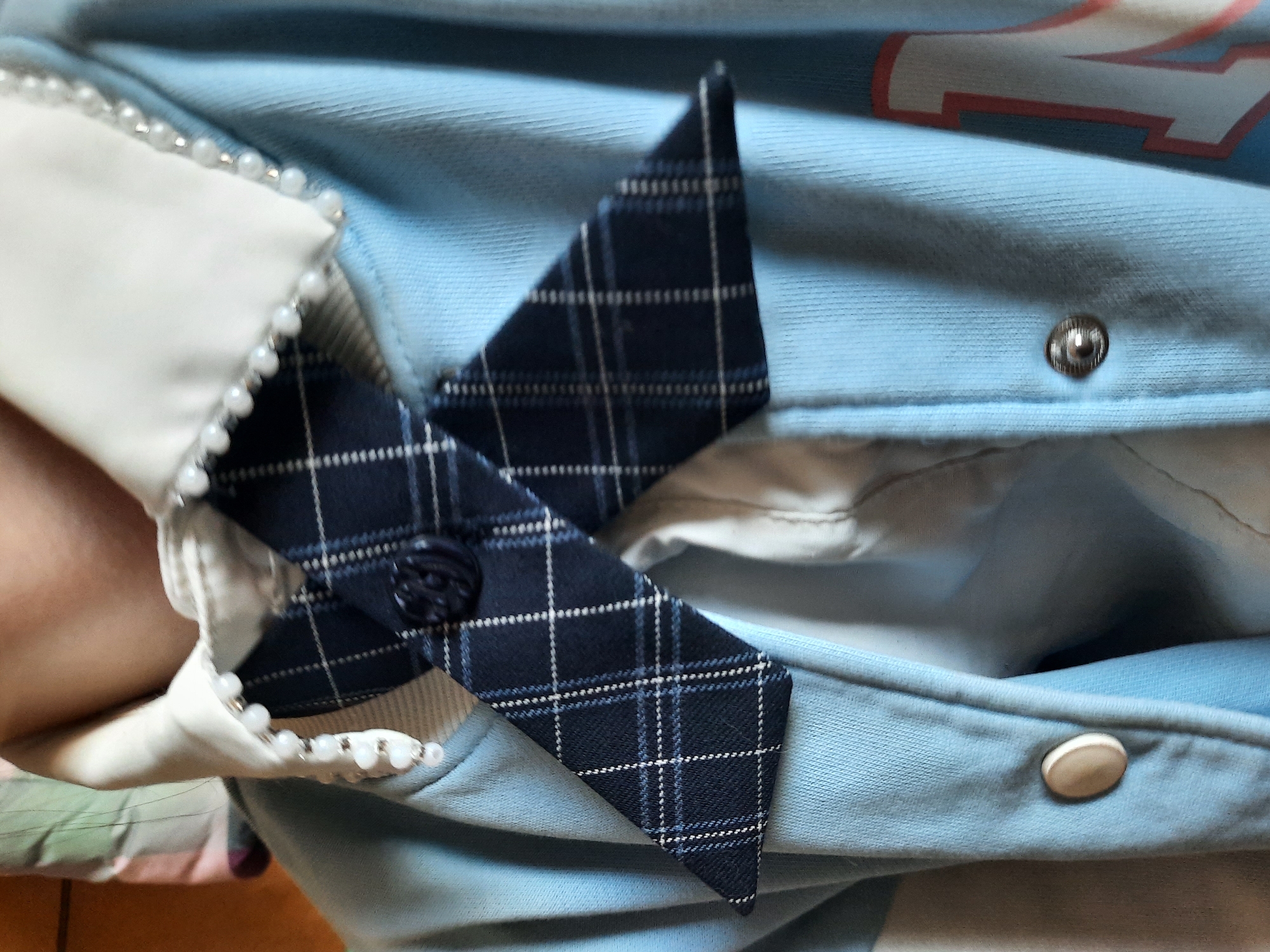 close-up of clothing. A light blue garment, possibly a jacket or shirt, is partially visible with a white collar adorned with pearl-like beads. A plaid bow tie is positioned over the collar. Part of a large number "27" is visible at the top. A silver snap button and a white button are present. The image was not taken in Krasnogorskoye, Russia.