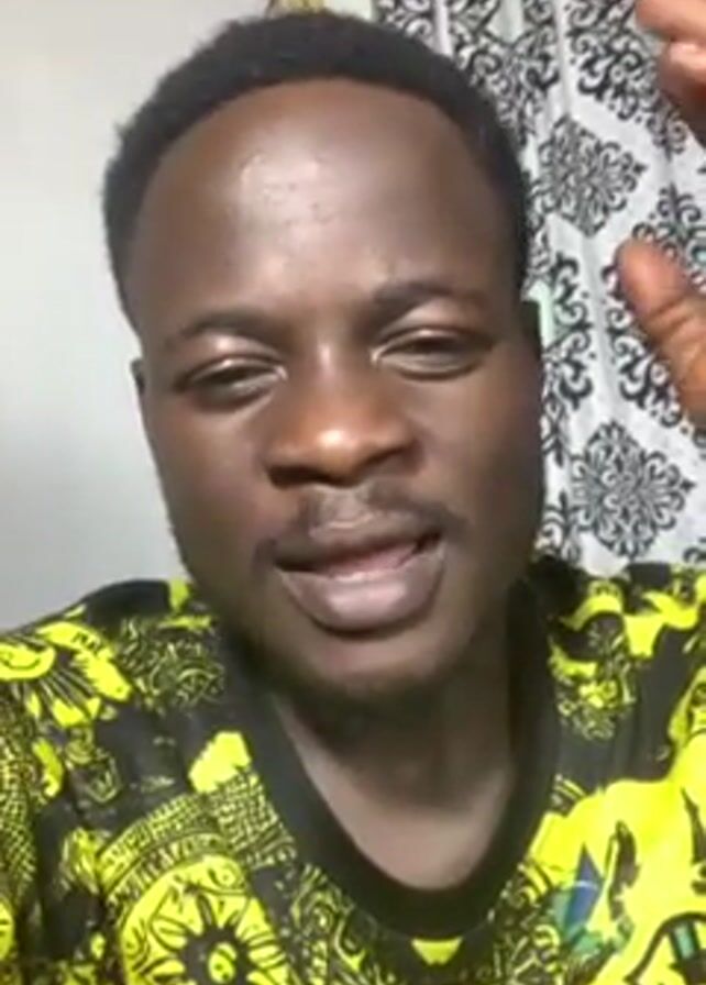 A medium-close, eye-level shot captures a man looking directly at the camera and speaking. The man has dark skin, short black hair, and a trimmed beard. He is wearing a yellow and black patterned shirt. Behind him is a white curtain with a black and gray ornate design. A wire is visible in the upper left corner of the frame. The lighting in the video is bright and even. The man appears to be recording a video message.