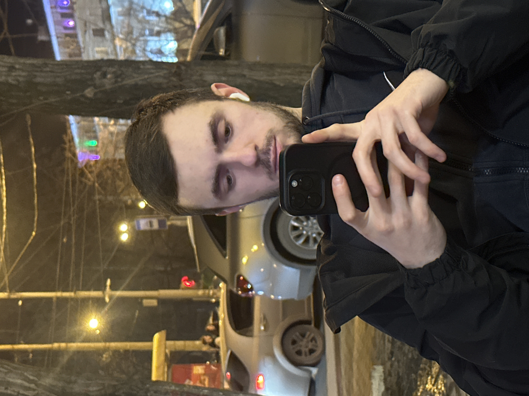 An outdoor nighttime scene in an urban area of Yekaterinburg, Russia, centers on a young adult male in the foreground. He has dark hair, a trimmed beard, and wears a dark hooded jacket. A white earbud is inserted into his right ear. He holds a black smartphone with multiple rear cameras in both hands, positioned in front of his face, and appears focused on the screen, possibly taking a photograph or viewing content. The man is situated between two large, dark tree trunks, suggesting a street lined with trees or a park. The ground immediately visible is dark and appears reflective, possibly wet. In the midground and background, an illuminated city street is visible. On the left, a silver sedan, possibly a Chevrolet Aveo, is parked or moving, with its rear left wheel showing visible dirt accumulation. Beyond this vehicle, two indistinct human figures are visible near a brightly lit area. Further to the left, a yellow structure, likely a portion of a bus stop shelter, is illuminated, alongside bright streetlights and a distinct red light, possibly from a traffic signal. On the right side of the background, a silver SUV is partially visible behind another tree. Overhead power lines are visible against the dark sky. A blue rectangular sign, consistent with a bus stop marker, is present on the far right. Distant buildings are illuminated with various lights, including prominent purple, green, and blue decorative lighting, indicating a lively urban street or square environment. Multiple streetlights cast bright, localized illumination throughout the scene.