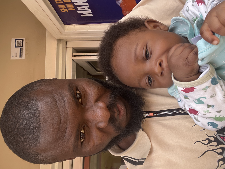 The image displays an adult male holding an infant, captured in a close-up indoor or semi-outdoor setting