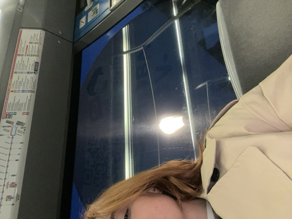 The image depicts the interior of a public transit bus in Tinqueux, France, confirmed by the visible "TINQUEUX MAIRIE" stop and other French text on an overhead route map. In the left foreground, a seated female individual is partially visible from the shoulder to the lower face. She has reddish-brown hair and is wearing a light beige trench coat. The upper section of the image displays a dark gray overhead panel with a bus route map affixed, detailing "Bus 1" and various stops. A large, dark-tinted window dominates the center, reflecting a prominent bright light source from the interior, faint structural lines, and a subtle reflection resembling a human face. To the right, a dark gray upholstered seat is visible, and a portion of what appears to be a farebox or ticket validation machine is present near the window frame. The exterior, visible through reflections, indicates dark conditions, consistent with nighttime.