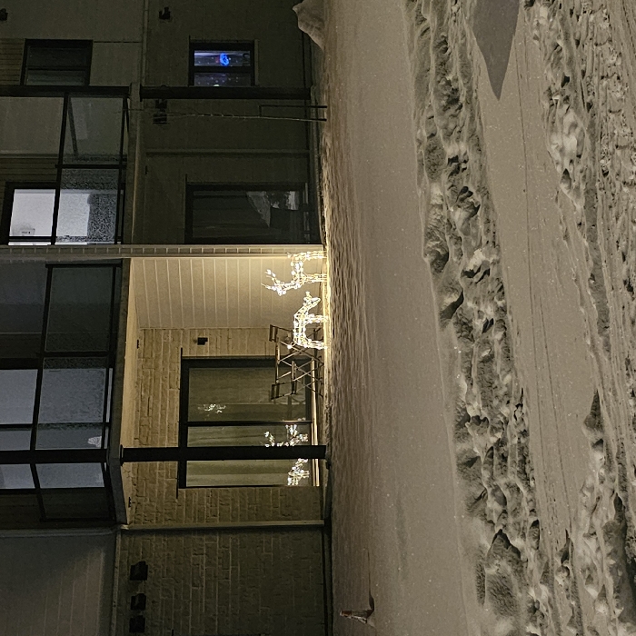 An apartment building stands adjacent to a wall of snow. The building has several windows with black frames. A lit, reindeer decoration hangs from a balcony. The snow is textured with ridges and drifts. The scene is dark, with light primarily coming from the reindeer decoration and reflections in the windows.