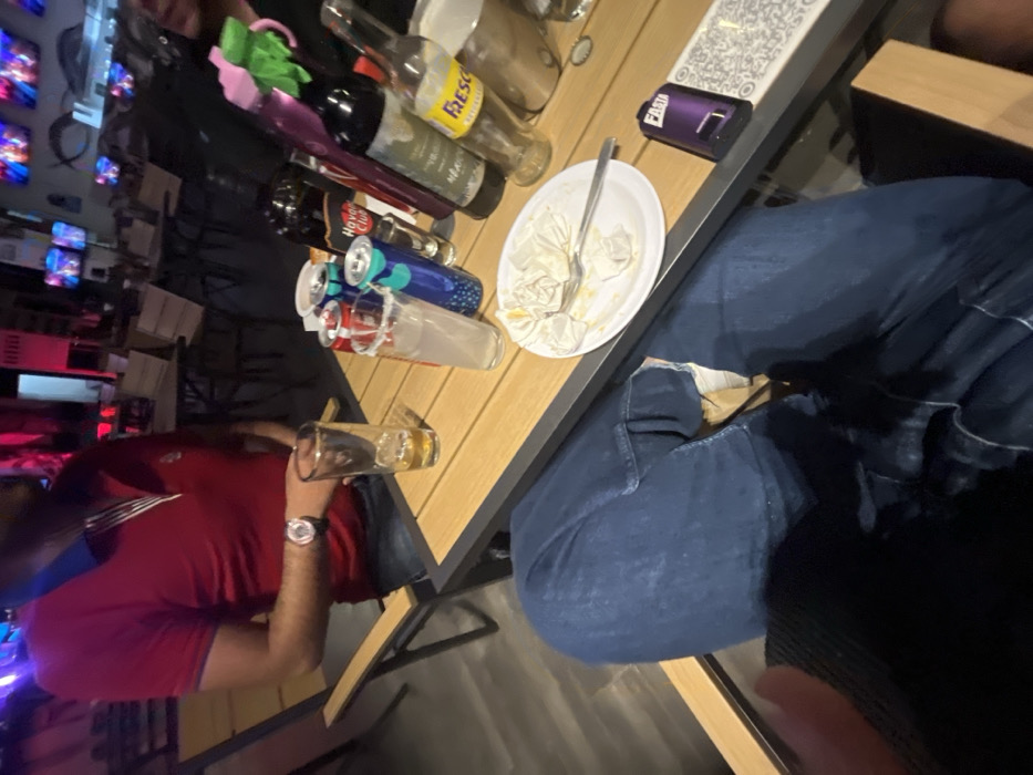 A table laden with bottles and cans sits near seated individuals. On the table are an empty plate with a fork, several bottles of alcohol including one labeled "Fresco", and multiple cans of what appear to be energy drinks. One person wears a red polo shirt and a wristwatch, holding a glass containing a yellowish liquid. Another individual is seen wearing blue jeans. The setting seems to be a bar or restaurant.