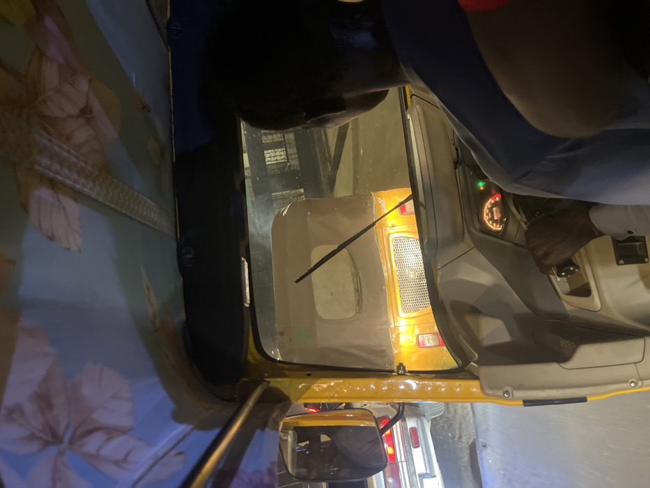 From inside a three-wheeled auto-rickshaw, the view includes the driver wearing a blue shirt, the vehicle's dashboard, and a glimpse of the driver's hand near the controls