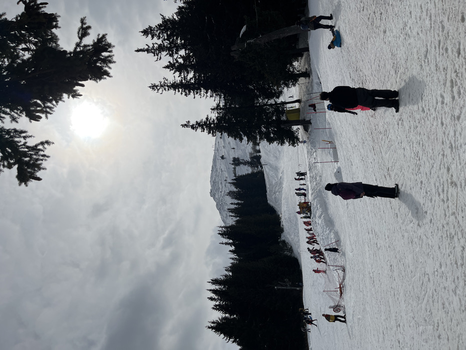The image presents a winter recreational scene on a snow-covered mountain slope located near Bistritsa, Bulgaria. The sky is largely overcast, with a bright, partially obscured sun glare visible in the upper-right quadrant, framed by the dark silhouette of a coniferous tree branch extending from the top. The foreground consists of a wide expanse of snow featuring visible boot and ski tracks. In the lower-right, three individuals are standing: two adults in dark clothing, one with a pink backpack, face uphill. A third, smaller individual in pink is partially visible between them. Further to the right, a person lies prone on a blue sled on the snow, with another adult in dark attire standing nearby. The midground depicts a busy ski slope with numerous individuals. A prominent line of approximately 15-20 people, many wearing colorful ski suits (red, yellow, blue), are horizontally distributed across the mid-left section, some equipped with skis. A smaller group is gathered slightly uphill and to the right of this line, near a low snow mound adorned with colorful objects. On the lower-left, an individual in a yellow jacket stands near orange and white safety netting. Red and orange marker poles are embedded in the snow at various points on the slope. A yellow hut is visible among dense, dark coniferous trees on the mid-right. The background features a large, rugged, snow-covered mountain peak, likely part of Vitosha, with discernible ski lift pylons on its upper slopes. Extensive coniferous forests border the ski slope on both the left and right sides and extend towards the base of the distant peak. The scene indicates an active winter sports environment.