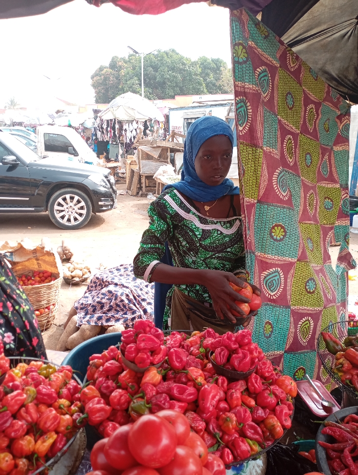 An outdoor market scene in Karu, Nigeria, shows a young female vendor positioned behind a produce stall