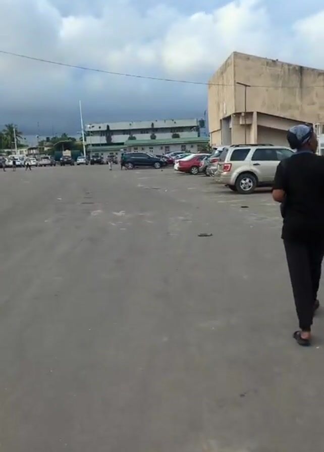 n outdoor parking lot with several parked cars and a person walking away from the camera. The person is wearing a black t-shirt, dark pants, and a head covering. The parking lot is paved and has some visible cracks and debris. In the background, there are buildings and a cloudy sky. The camera pans slightly to the left, following the person walking. The overall scene is a somewhat deserted and overcast parking area.