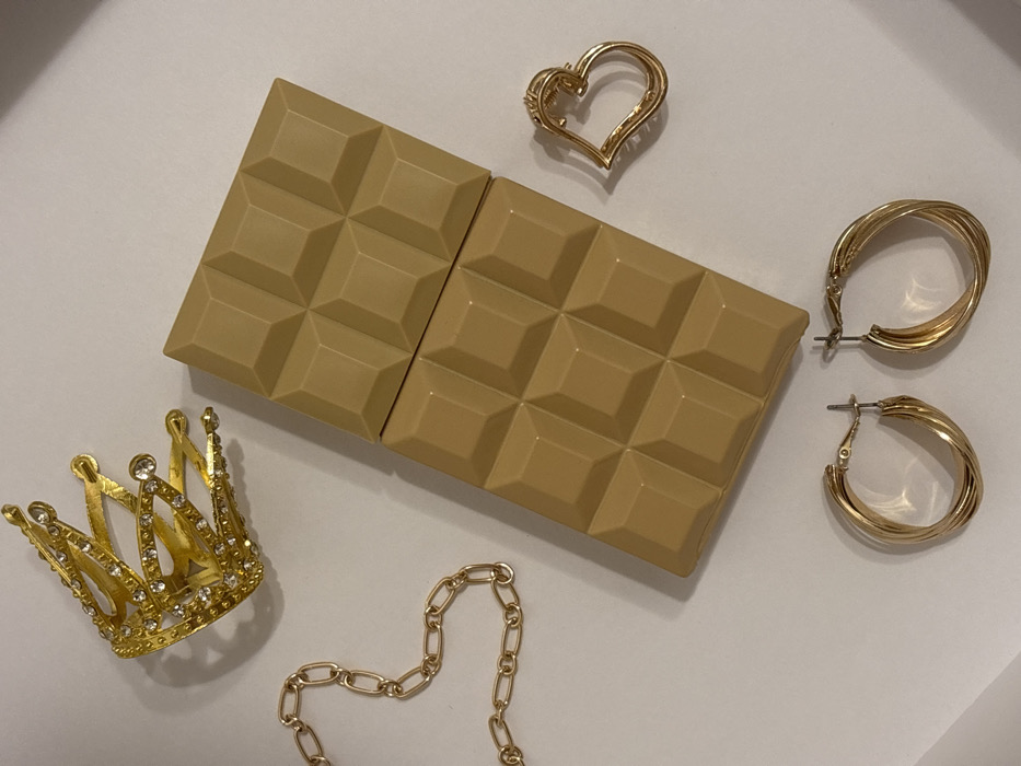The scene is set in Voluyak, Bulgaria, on a plain, light-colored surface. A rectangular, tan-colored object, designed with a grid of twelve raised squares to resemble a chocolate bar, occupies the center-right portion of the frame. To its upper left, a small, golden-colored crown adorned with clear faceted stones is positioned. A golden-colored metal chain, composed of elongated oval links, lies curled in the mid-left. A small, golden-colored, open heart-shaped charm or pendant is situated to the right of the chocolate bar-shaped object. In the bottom-center, a pair of golden-colored hoop earrings with a twisted pattern is resting. All objects are stationary, casting subtle shadows to their right, indicating a light source from the upper left. No individuals or dynamic actions are present.