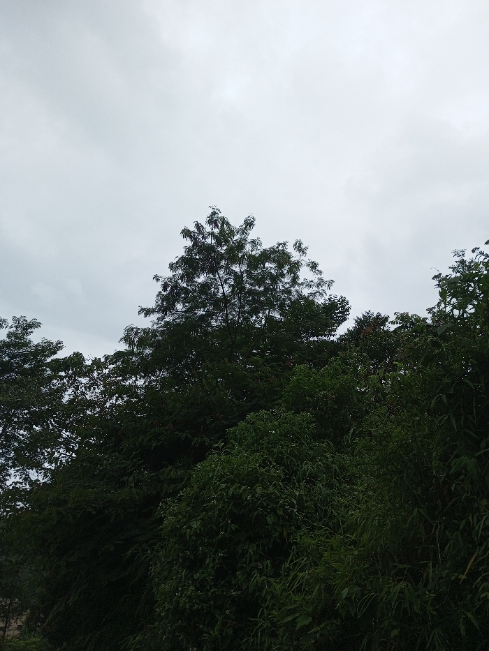 The image displays an outdoor scene in Ambakirano, Madagascar, dominated by vegetation under an overcast sky. The top approximately 40% of the frame shows a light grey, uniformly cloudy sky. The lower approximately 60% is composed of dense, dark green foliage. A tall tree with a distinct crown of numerous small leaves, dark green in color, is centrally positioned towards the left, with its upper canopy reaching into the sky area. To the right and below this prominent tree, a dense mass of various green plants, shrubs, and other tree canopies fills the foreground and midground, creating a lush, layered vegetated environment. No people, discernible objects, actions, or interactions are visible within the frame.