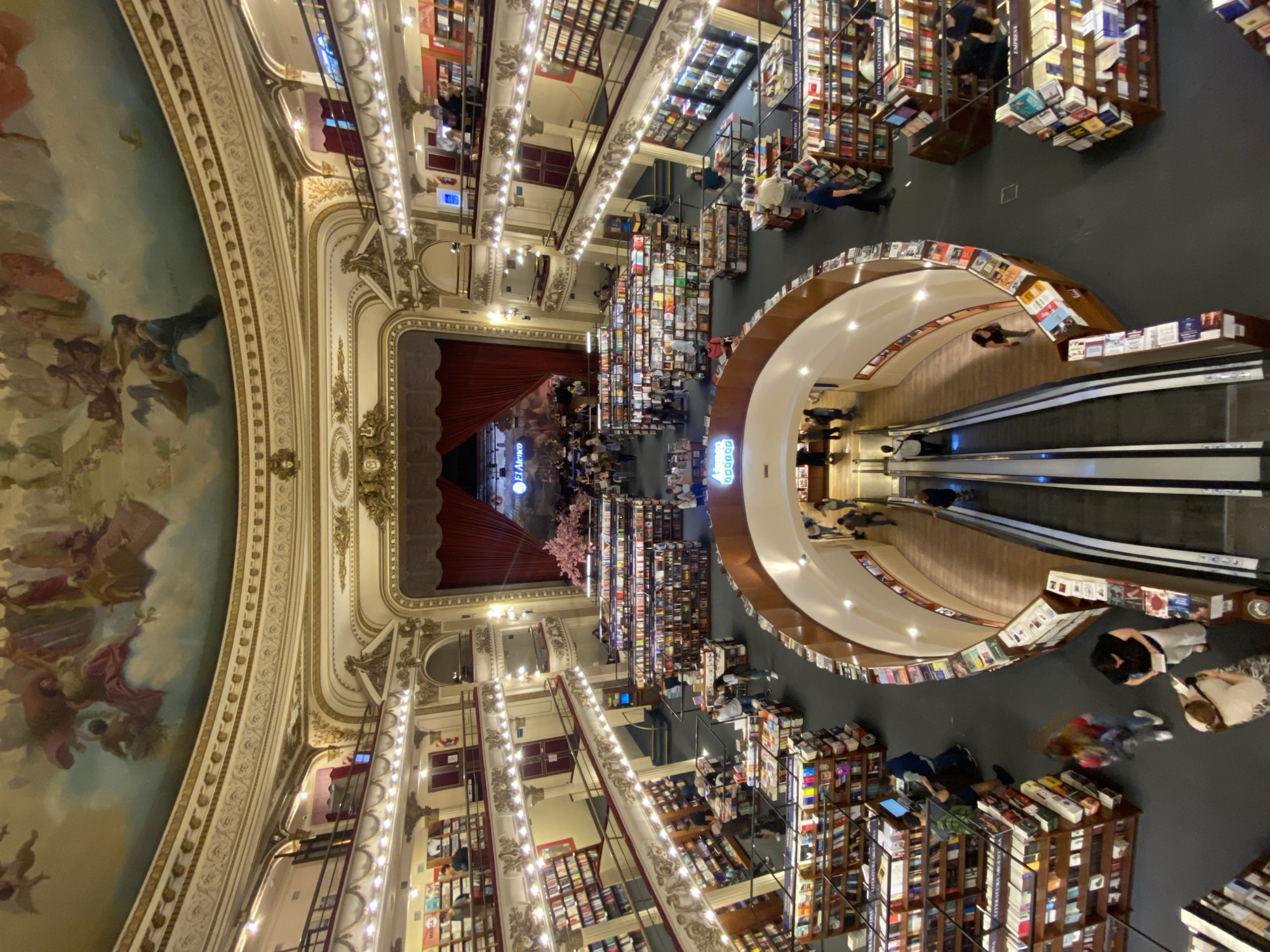 This image depicts the interior of the El Ateneo Grand Splendid bookstore, located at Santa Fe Avenue 1860 in the Recoleta neighborhood of Buenos Aires, Argentina. The scene is observed from an elevated perspective within the multi-level former theater. The domed ceiling features an elaborate fresco portraying classical or allegorical figures amidst clouds, bordered by ornate gold and white decorative trim. Below this, four visible tiers of balconies encircle the main space. Each balcony level displays decorative balustrades, continuous strings of warm light fixtures, and walls lined with bookshelves. Several red-doored entrances are visible on these upper levels. At the far end, the original theater stage is discernible, framed by a proscenium arch, with a large, drawn dark red velvet curtain across its front. In the area where the orchestra pit and front stage would have been, a café is operational, populated by individuals seated at tables and chairs. A prominent large pink faux-blossom tree serves as a decorative element in this section. Above the stage curtain, a screen or banner displays the "El Ateneo" logo. The expansive ground floor is occupied by numerous freestanding, dark wood bookshelves arranged in rows and clusters, all densely filled with books. A central, curved structure houses two parallel escalators, descending to a lower level. This curved structure's exterior is also lined with book displays, while its interior features wooden flooring around the escalators. Approximately 50-70 individuals are present throughout the store. Patrons, casually dressed, are engaged in various activities including browsing books, walking through aisles, standing, sitting at the café, and using the escalators. One individual on the ground floor is operating a desktop computer near a bookshelf. The environment is brightly illuminated, orderly, and shows active commercial operation within a historically ornate architectural space.