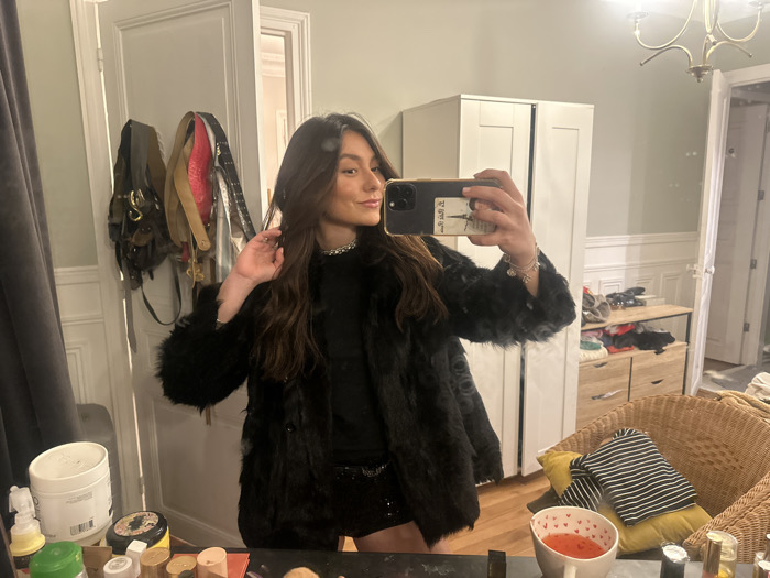 A young woman is depicted in a mirror selfie taken indoors. She has long, dark brown hair and is wearing a black faux fur jacket over a black mock-neck top, with a glimpse of a black sequined bottom. A silver-colored chain necklace is visible, as are silver-colored bracelets on her left wrist. She holds a dark-colored smartphone, featuring a graphic of the Eiffel Tower and the word "PARIS" on its case, in her right hand, angled towards the mirror. Her left hand is raised, touching her hair near her temple. The reflected environment shows a room with light green walls featuring white wainscoting and molding, consistent with Parisian architectural styles. A brass-colored chandelier is visible on the ceiling. To the right of the woman's reflection, a white two-door wardrobe stands next to a wooden shelving unit or dresser holding various items and clothes. To the left, a door with multiple bags hanging from hooks is present. The surface in the immediate foreground, where the mirror rests, is cluttered with numerous cosmetic bottles, jars, and a white mug filled with a reddish liquid. A wicker chair with a yellow pillow and a black-and-white striped garment is also visible in the reflection on the right. The explicit presence of the Eiffel Tower and "PARIS" on the phone case confirms the location as Paris, France.