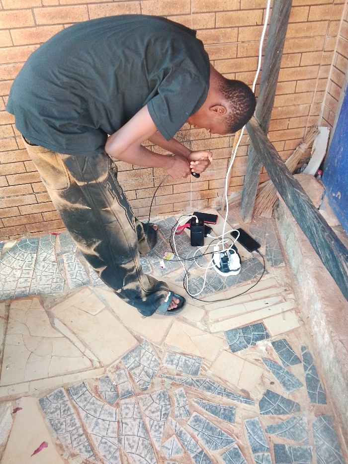 This image depicts a male individual managing electronic devices on the ground in Agbor, Nigeria, under bright daylight