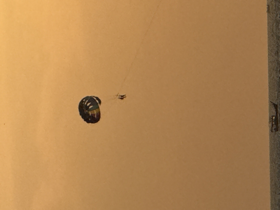 The image presents an outdoor scene at Cenang Beach, Malaysia, under an orange-hued sky, indicative of either sunset or sunrise conditions. A multi-colored parasail, predominantly dark blue or black with vertical green and yellow striped sections, is visible in the upper-middle left portion of the frame. Two human figures, appearing as dark silhouettes, are suspended directly beneath the parasail via harnesses. A thin line, presumed to be a tow rope, extends diagonally downwards from the parasailers, exiting the frame towards the right. The bottom segment of the image reveals a dark, rippled body of water, indicating ocean conditions. On the water's surface, positioned in the lower left quadrant, is a single dark-colored boat with a distinct canopy structure in its midsection. The boat appears to be either stationary or in slow transit.