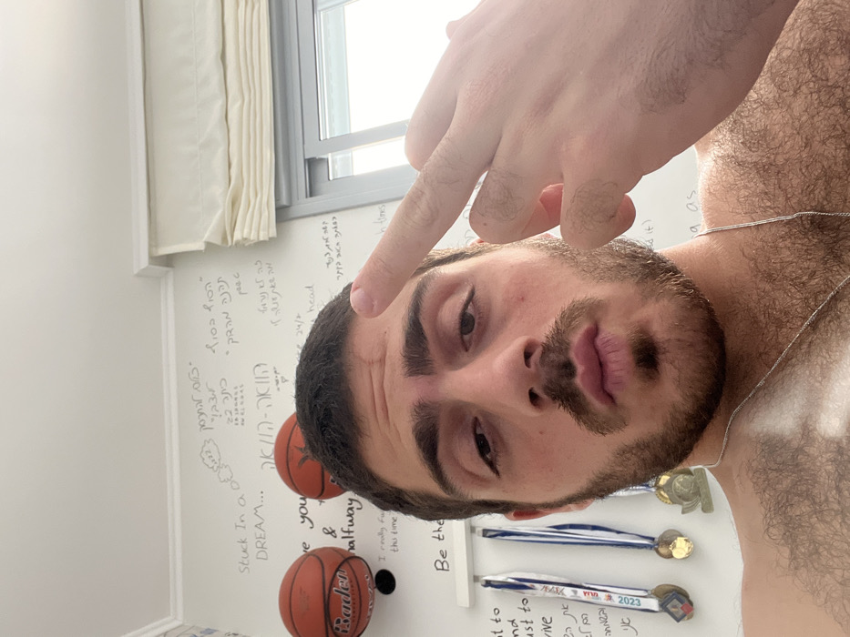 This image depicts a young adult male in a private room within a residence in Rishon LeZion, Israel. The male, shirtless and wearing a thin silver chain, faces the camera directly with a pursed-lip expression. He has dark hair, a beard, and visible chest hair. A prominent mark or scar is visible on his forehead between his eyebrows, and another above his left eyebrow. His right hand is raised with the index finger pointing towards his upper forehead, near the hairline. The white wall behind him is extensively covered with handwritten text in black marker or pen, featuring both English phrases (e.g., "Stuck In a DREAM...") and Hebrew script. To the left, two orange Baden basketballs are mounted on the wall. Below these, a white horizontal rack displays multiple medals, several attached to blue and white ribbons, one of which visibly indicates "2023." To the right, a window with a white frame and a light-colored pleated Roman blind is partially visible, allowing ambient daylight into the room.