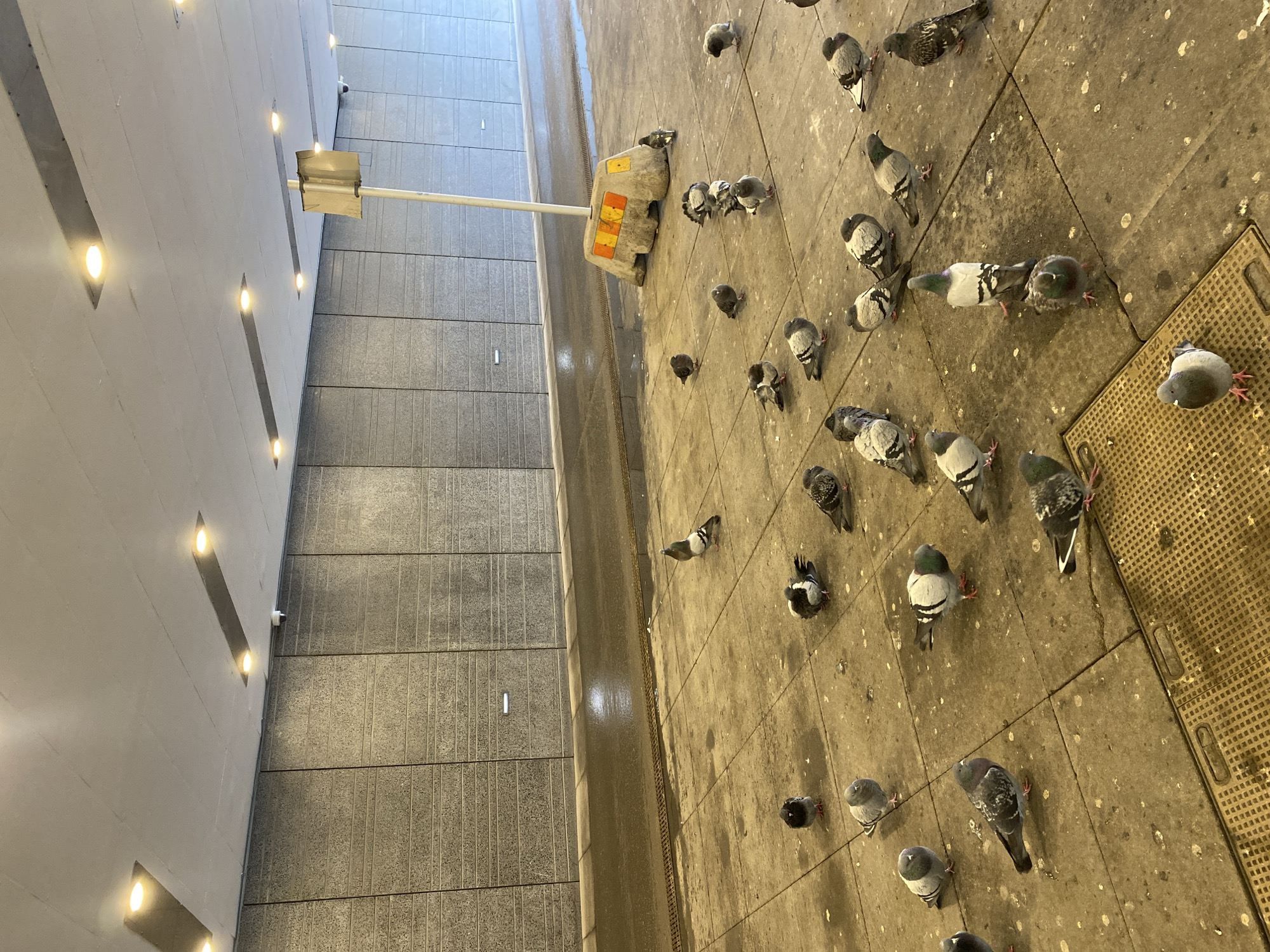 This image depicts an urban underpass in Uppsala, Sweden. A congregation of approximately 30 to 40 rock pigeons (Columba livia) is scattered across a concrete-tiled pavement, which exhibits significant accumulation of bird droppings. In the lower left foreground, a metal grate is visible. Adjacent to the pavement, a wet asphalt roadway extends into the background. The underpass walls are constructed from textured, dark grey panels arranged horizontally. The light-colored concrete ceiling features multiple recessed rectangular luminaires and smaller circular lights, along with several ceiling-mounted surveillance cameras. A light-colored pole, supporting an unreadable rectangular sign, is anchored in a concrete barrier marked with yellow and orange panels, positioned on the pavement towards the right side of the frame. The pigeons are generally stationary or moving slowly on the pavement; no other subjects or explicit actions are observed.