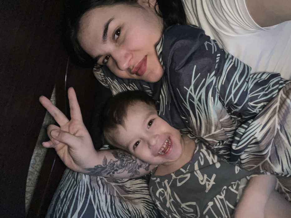 A smiling woman and a young child are lying in bed, presumably together. Both are looking at the camera. The woman has dark hair and is wearing a patterned top. The child is wearing a similar patterned outfit and has a wide grin revealing their teeth. The woman's arm is extended, making a peace sign. The bed is covered in matching bedding. The photo appears to be a selfie.