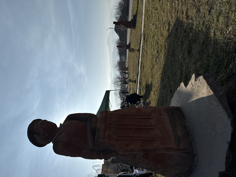 The image captures an outdoor scene in Dsegh, Armenia, under a bright, partly cloudy sky. In the immediate foreground, a reddish-brown stone sculpture of a person, appearing to be a male figure wearing a cap and depicted from the waist up with hands resting on a pedestal, stands on a rough concrete base. This sculpture is heavily backlit, casting a dark silhouette and a distinct shadow onto the dry, patchy grass. To the left of the main sculpture, a green canopy tent is partially visible, under which several indistinct figures are present. The middle ground consists of a wide grassy area with a discernible dirt path or road winding through it. Scattered across this expanse are at least four additional reddish-brown stone sculptures of varying human-like forms, positioned at different distances. Several human figures are distributed throughout this middle ground, some near the green tent, and others further back observing the sculptures or moving. One figure is seen bending down near the tent. In the background, bare deciduous trees are visible, along with a few residential or utility structures, including a building with a reddish roof and utility poles. A distinct street light pole stands vertically in the mid-right background. A range of hazy, distant mountains or hills forms the horizon line. The scene is illuminated by direct sunlight, casting long shadows and indicating a clear day, likely in late autumn or winter given the bare trees and grass color.