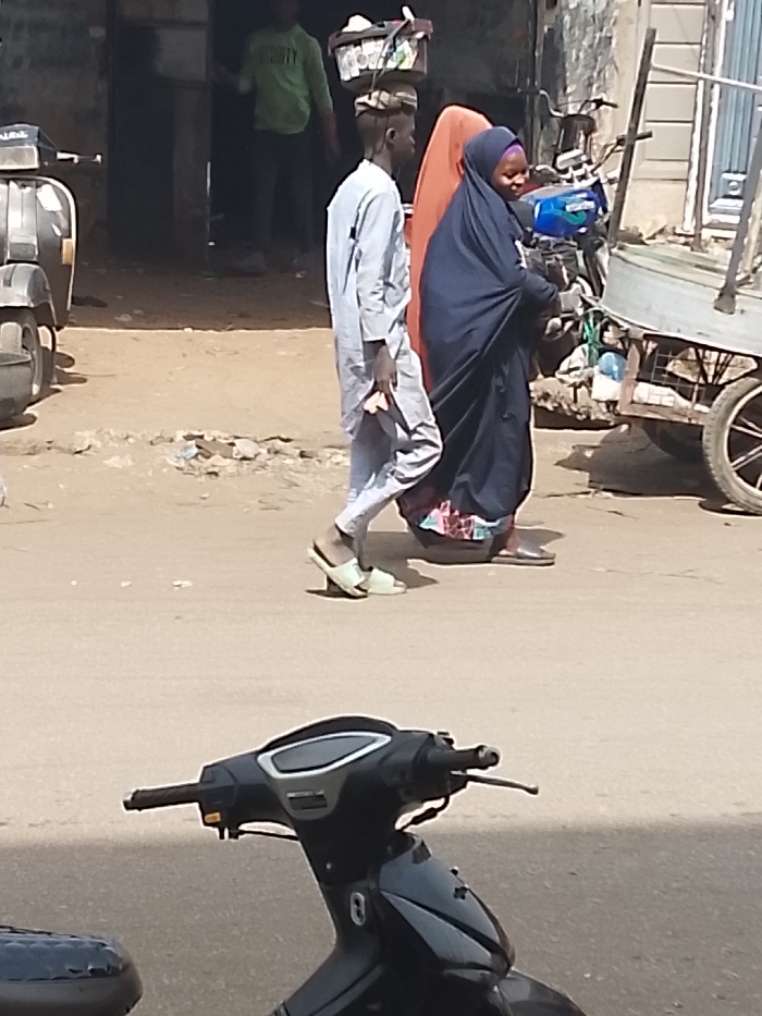 The image captures a daytime street scene in Kofar Mazugal, Nigeria, from the perspective of a stationary dark-colored scooter, whose handlebars and front section are visible in the foreground. In the midground, two individuals are walking from left to right across an unpaved or dirt road littered with small debris. The first individual, on the left, is a young male wearing a light-colored, long-sleeved tunic and matching trousers. He balances a light-colored, woven basket, containing indistinct items, on his head. His left hand holds a dark, flat object. He wears light-colored, open-toed slip-on sandals. Adjacent to and slightly behind him on the right is a female individual. She wears a dark blue full-length garment (abaya or similar) over what appears to be a patterned undergarment visible near her feet. She also wears an orange head covering (hijab or scarf) and a darker blue layer over her head and shoulders (khimar or another drape). She wears light-colored, flat slip-on shoes. Her gaze is directed slightly to her right, and a subtle smile is present on her face. Her right hand is held near her chest. In the background, to the far left, a light-colored scooter or motorcycle, possibly a Vespa, is parked. To the left-center, a dark doorway or entrance to a building is visible, with a person in a light green long-sleeved top partially obscured within. To the right, a two-wheeled utility cart with a metal frame and spoked wheels is parked. Behind it, a blue motorcycle is partially visible against a light-colored building or wall. The scene is illuminated by strong sunlight, casting visible shadows.