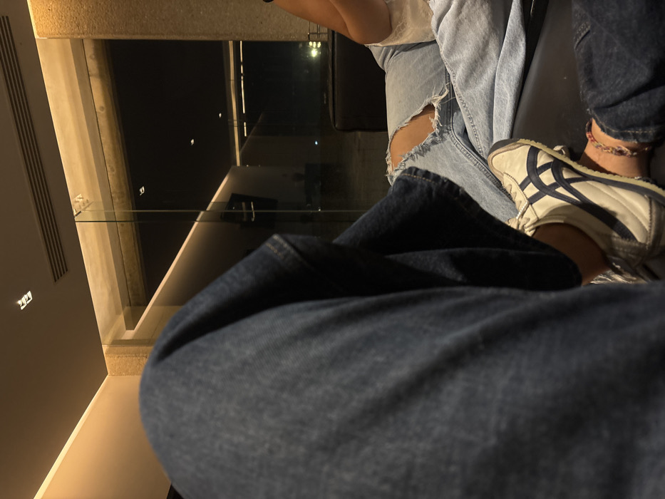 A close-up shows two people sitting, each wearing jeans. One person sports light-wash, ripped jeans and white sneakers with navy stripes. The other person is wearing dark-wash jeans. The background shows a dimly lit interior, likely a room with a large window overlooking a dark, nighttime cityscape. The lighting is soft and ambient.