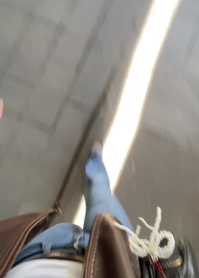 first-person view of someone walking on a gray tiled surface. The person is wearing blue jeans, a white shirt, and silver shoes. A brown jacket and a black purse with white pearl necklaces draped on it are visible. The video is shaky and blurry, making it difficult to see details clearly.