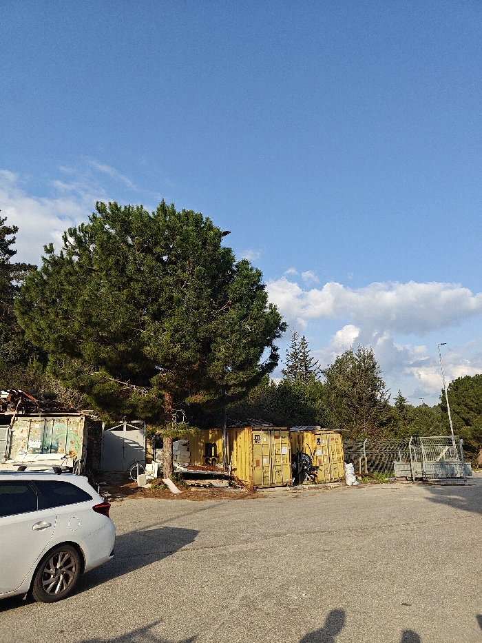 The scene depicts an outdoor paved lot in Nesher, Israel, with adjacent storage containers and natural vegetation under a clear blue sky with scattered white cumulus clouds. In the foreground, an asphalt surface extends across the lower portion of the image, exhibiting minor cracking. Distinct dark shadows, cast by at least two human figures, are visible on the lower right of the pavement, indicating the presence of individuals out of frame. The shadow of a parked vehicle is also visible on the left side of the pavement. A white station wagon, rear quarter and wheel visible, is parked on the left side of the paved lot, facing away from the viewer. A large, dense pine tree stands centrally in the midground, its foliage reaching into the upper left of the frame. Behind the tree and vehicle, from left to right, are several structures: 1. An olive green, weathered shipping container is partially visible behind the white vehicle. 2. A light-colored, possibly gray, metal structure or gate is situated behind the pine tree. 3. Two yellow shipping containers are positioned side-by-side to the right of the pine tree. The left yellow container has faded markings on its side. The right yellow container has a dark, unidentifiable object leaning against its visible end. 4. Various debris, including wooden pallets and white bags, are scattered on the ground around the containers and the base of the pine tree. 5. A chain-link fence runs horizontally across the midground to the right of the yellow containers. 6. A large, gray metal vehicle gate structure is visible on the far right, beyond the fence. 7. A tall, dark streetlamp pole with a luminaire is visible in the upper right, rising above the background vegetation. The background consists of dense green foliage, primarily coniferous trees, extending across the entire upper right portion of the image. No active individuals or specific interactions are visible within the frame.