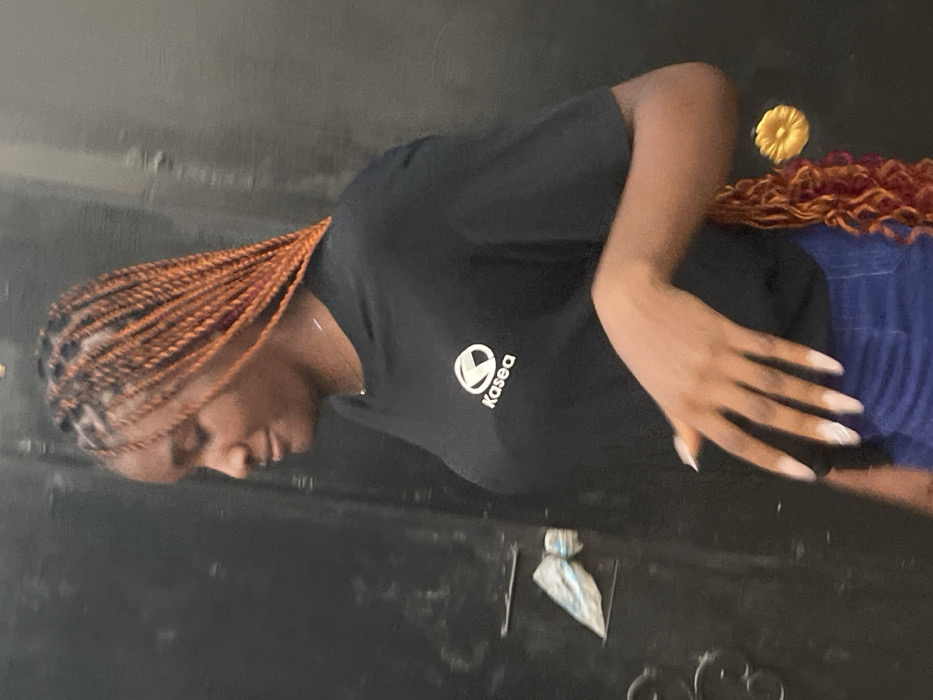 A person with orange braided hair wears a black t-shirt with a white "Kasea" logo