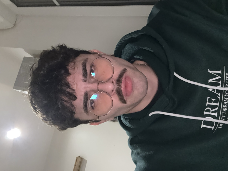 A person wearing round glasses and a fake mustache looks toward the camera. They are wearing a dark green hoodie with white drawstrings. The hoodie has a printed text that says "DREAM" and "DON'T DREAM YOUR LIFE". The background is a plain wall with a light fixture and other objects in the blurry distance. The image is slightly tilted.