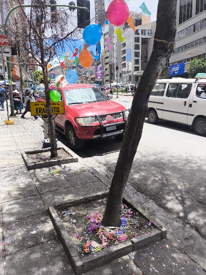 A bustling city street displays a red pickup truck parked near a sidewalk. Balloons and festive decorations adorn the street, hinting at a celebration. Sidewalks are composed of square tiles with trees planted within concrete-rimmed plots filled with colorful confetti-like litter. Pedestrians stroll along the sidewalks and vehicles proceed in the street. A white van is seen slightly behind the pickup truck. Buildings line the street, and sunlight illuminates the scene.