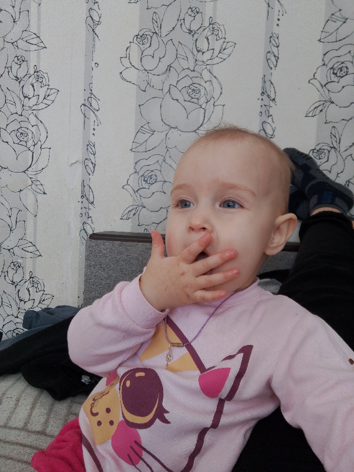 A young child, appearing to be a toddler, is depicted indoors in Kuyeda, Russia. The child has fair skin, light-colored hair, and blue eyes, and is dressed in a pink long-sleeved shirt featuring multi-colored graphic designs, and pink bottoms. A light purple cord necklace with a small, metallic, cross-shaped pendant is visible around the child's neck. The child's right hand is positioned over their mouth, with fingers potentially showing residue from food or drink, and the gaze is directed upwards and slightly to the left of the frame. The child is seated or held, partially obscuring the lower body. In the background, to the right, a person's leg and foot, wearing a dark blue sock with lighter blue stripes, are visible. The immediate background consists of a light grey upholstered surface, likely part of furniture such as a couch or bed. The wall behind the child is covered in wallpaper featuring a pattern of outlined roses and vertical decorative stripes on a white background, with some visible wear or discoloration.